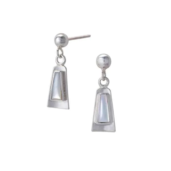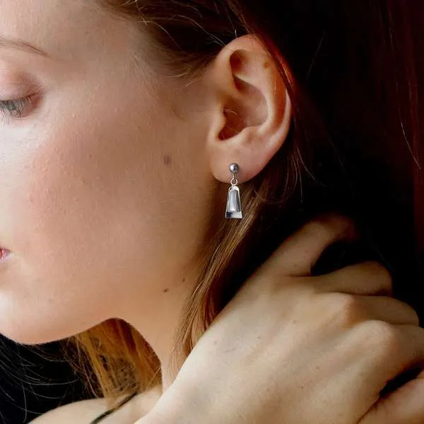 These earrings feature a refined trapezoid design, crafted from silver and accented with shell stones. The soft, iridescent sheen of the shell contrasts beautifully with the sleek silver, creating a versatile and elegant look. Shell is often associated with tranquility and calm, bringing a sense of peace and harmony to the wearer.