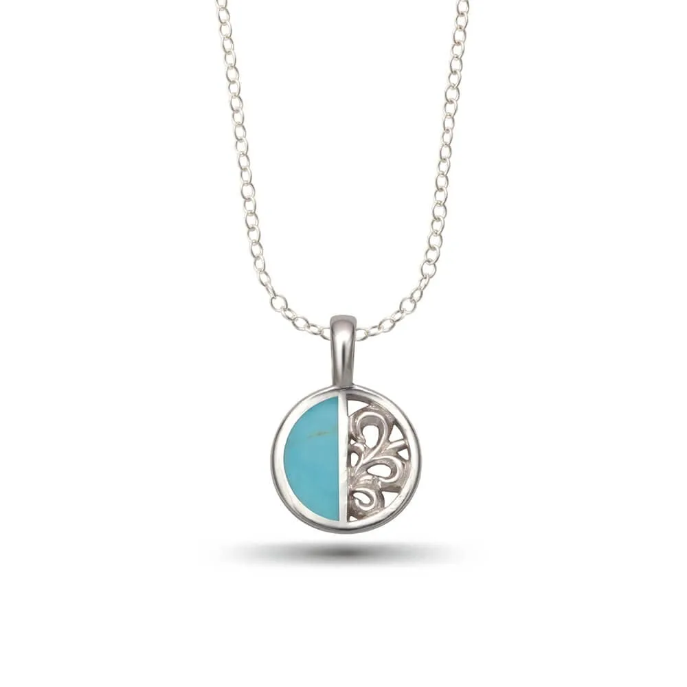 Skip to contentThis pendant features a striking design with half of the circular frame showcasing a smooth, vibrant turquoise stone, while the other half is intricately adorned with a delicate arabesque pattern. The contrast between the polished turquoise and the ornate metalwork creates a balanced and harmonious look. Perfect for adding a meaningful, yet refined touch to your outfit, this pendant combines nature’s beauty with artistic craftsmanship.