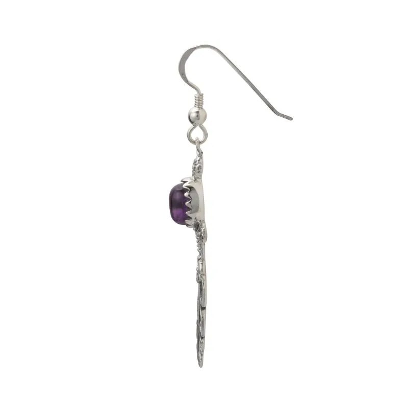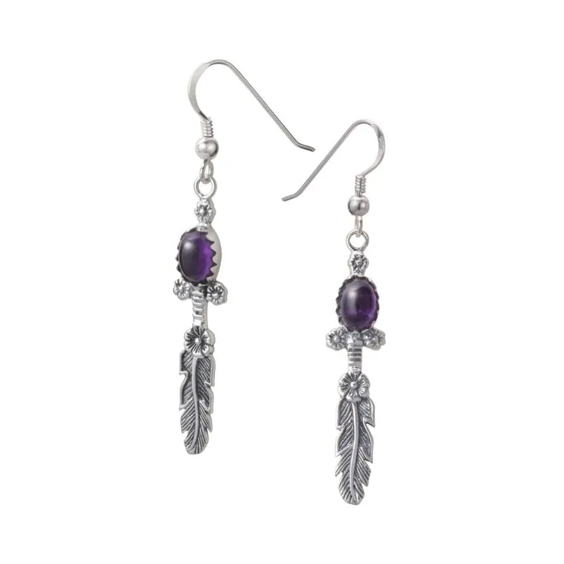 These earrings feature a striking design combining sterling silver and amethyst. The oval amethyst stones are framed by delicate feather and flower motifs, reflecting Native American artistry. Known for promoting clarity and peace, the amethyst adds both beauty and meaning to the design. These earrings offer a unique, culturally inspired look, making them a perfect choice for those seeking an elegant yet meaningful accessory.